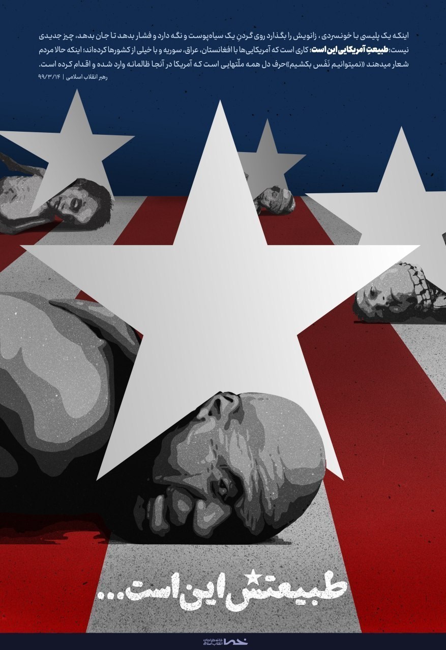 به گزارش روابط عمومی مرکز هنرهای تجسمی حوزه هنری به نقل از خبرگزاری تسنیم؛ طی سخنرانی رهبر فرزانه انقلاب اسلامی که فرمودند: «اینکه یک پلیسی با خونسردی، زانویش را بگذارد روی گردنِ یک سیاهپوست و نگه دارد و فشار بدهد تا جان بدهد، چیز جدیدی نیست؛ طبیعتِ آمریکایی این است؛ کاری است که آمریکاییها با افغانستان، عراق، سوریه و با خیلی از کشورها کردهاند؛ اینکه حالا مردم شعار میدهند «نمیتوانیم نَفَس بکشیم»حرف دل همه ملّتهایی است که آمریکا در آنجا ظالمانه وارد شده و اقدام کرده است.» باعث شد تا دانیال فرخ، از هنرمندان خانه طراحان انقلاب اسلامی، پوستر «طبیعتش این است» را طراحی و منتشر کرد.