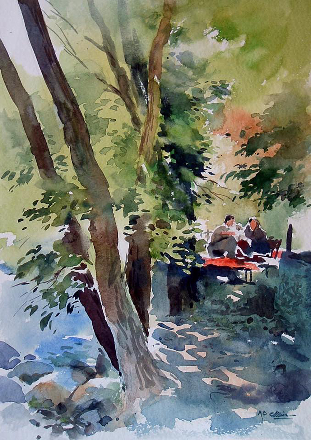 «از دورانی که در هـنرستان اصفهان مشغول به تحصیل هنر بودم به آبرنگ علاقهمند شدم و از همان سالها به آموختن این شیوه از نقاشی پرداختم،دیدن آثار استادانی چون یرواند و سمبات در این راه برایم بسیار سودمند بود.در مورد آبرنگ باید گفت که تکنیک آبرنگ در نقاشی از مشکلترین تـکنیکهاست.در ایـن روش هر قدر تعداد قلم(تاش)روی اثر کمتر باشد،کیفیت آن بهتر خواهد بود.در آبرنگ،نقاش نمیتواند چیزی را در حین نقاشی عوض و یا از بین ببرد، پس یک تصمیم و تفکر اولیه بـاید کـاملا منطقی و حساب شده باشد.البته منظورم از منطقی و حساب شده رد احساس در این شیوه نیست،بلکه تمام این موارد که اصولا فنون کار به شمار میروند در استحالهای از احساس هنرمند شکل میگیرند و سپس روی صفحه نقش میبندند».