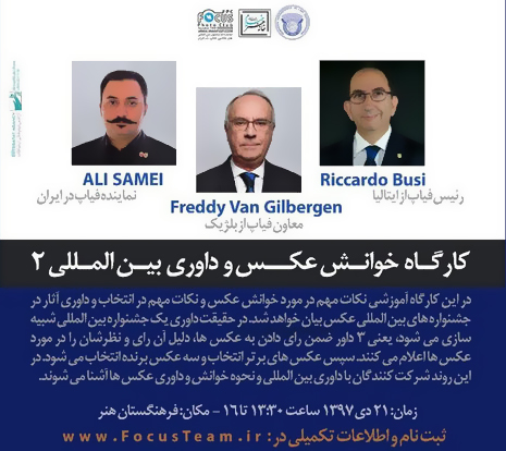 به گزارش روابط عمومی مرکز تجسمی حوزه هنری، کارگاه «خوانش عکس و داوری بین المللی» ۲۱ دی با حضور ریکاردو بوسی رییس فیاپ از ایتالیا، فردی ون گیلبرگن معاون فیاپ از بلژیک و علی سامعی نماینده فیاپ در ایران برگزار میشود.