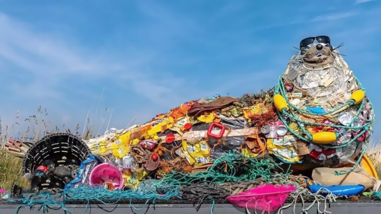 خلق مجسمه‌ای به شکل فُک با زباله‌های پلاستیکی