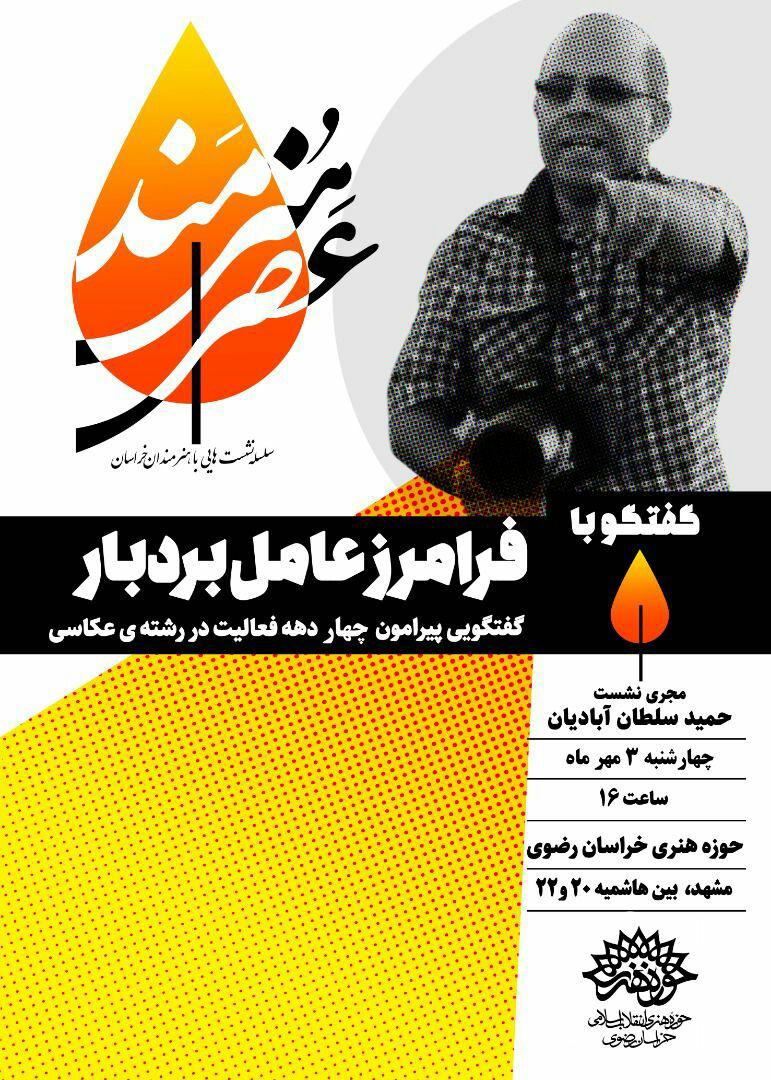 اولین جلسه از سلسله نشست‌های «عصر هنرمند» حوزه هنری خراسان رضوی با حضور فرامرز عامل بردبار از عکاس مطرح و پیشکسوت ، برگزار می‌شود.